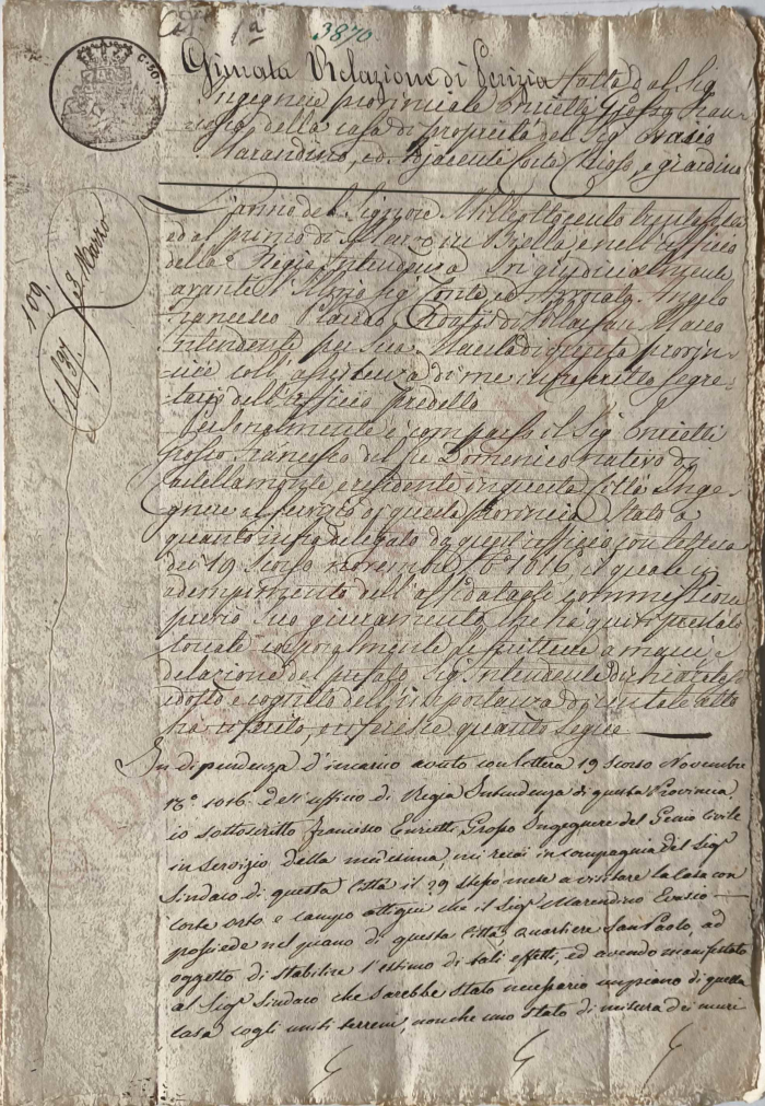 "Giurata relazione di perizia fatta dal Sig. Ingegnere provinciale Enrietti Grosso Francesco della casa di proprietà del Sig. Evasio Marandino, ed adjacente corte, chioso, e giardino"