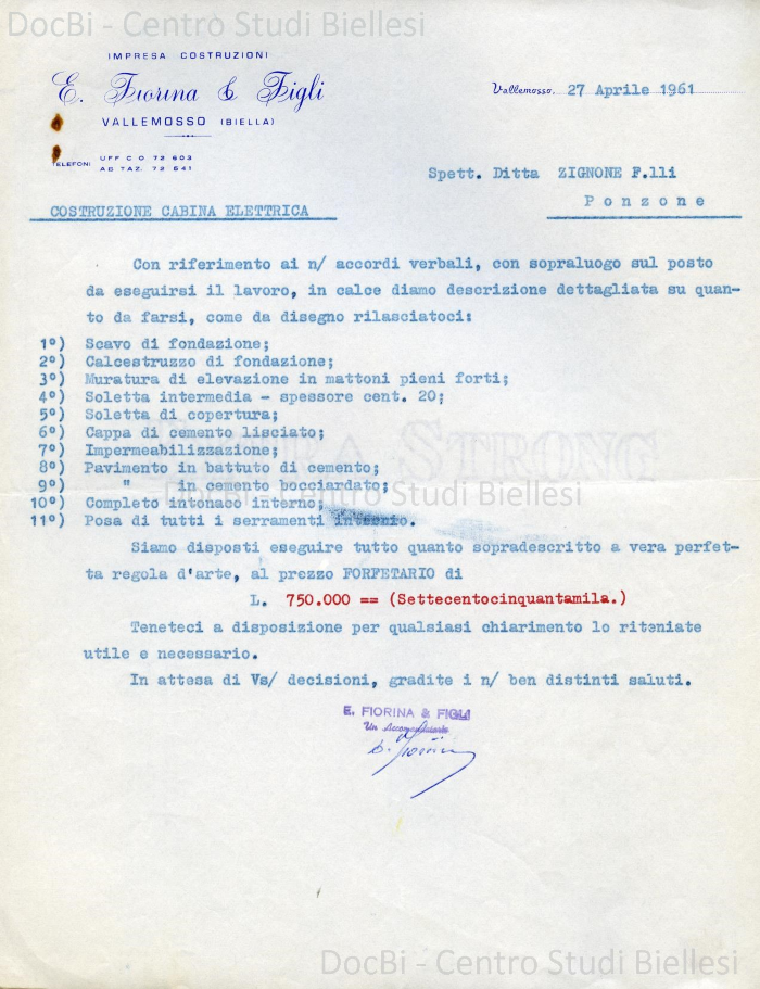 Atto con copia della fattura inviata dallo Stabilimento Meccanico Biellese S.A. e mai saldata dalla ditta Zignone 1911
