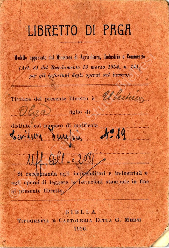 Libretto di paga di Olga Ubertino. Modello approvato dal Ministero d'Agricoltura, Industria e Commercio