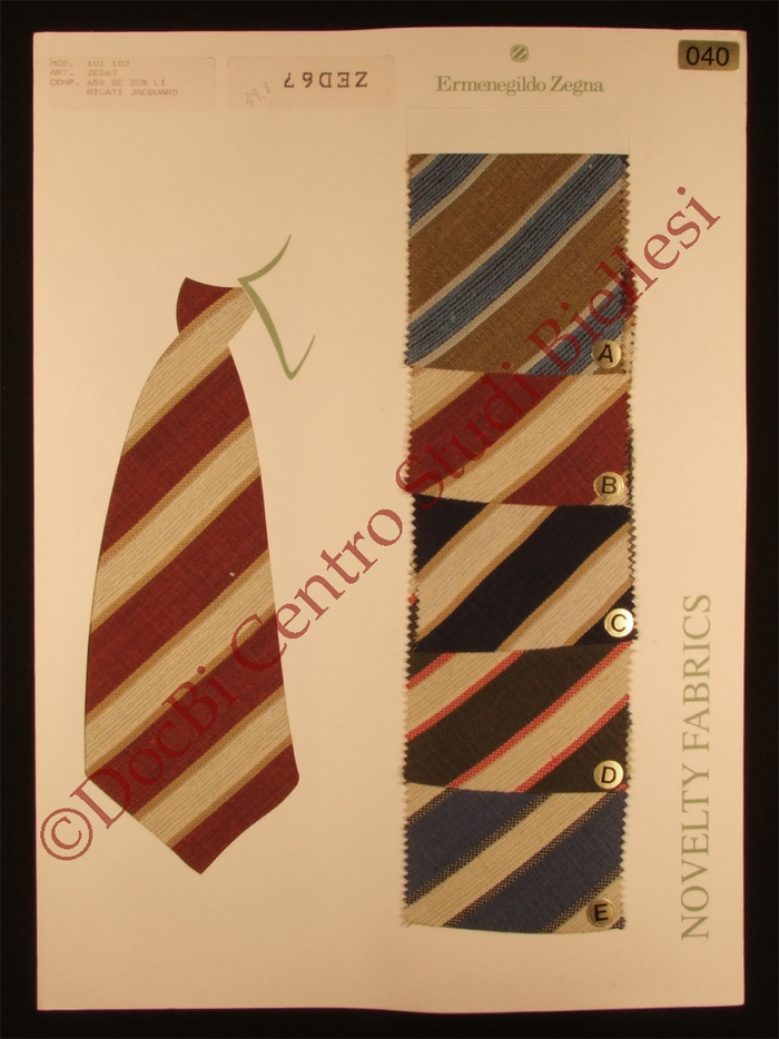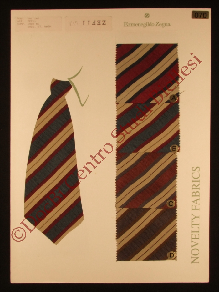 Il dossier contiene 21 cartelle campioni di tessuti per cravatte. Collezione e datazione non disponibili. I tessuti presenti sono: seta (rigati jacquard), misto seta - lino (rigati jacquard), misto seta - lino (jacq. St. washed), seta (jacq. St. washed)