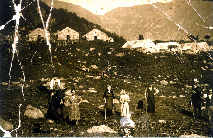 Alpe Cusogna: la famiglia di Prina Cerai Adele (coniugata con Pierino, qui assente) in posa nel pascolo antistante le baite; esse sono in bella vista sullo sfondo